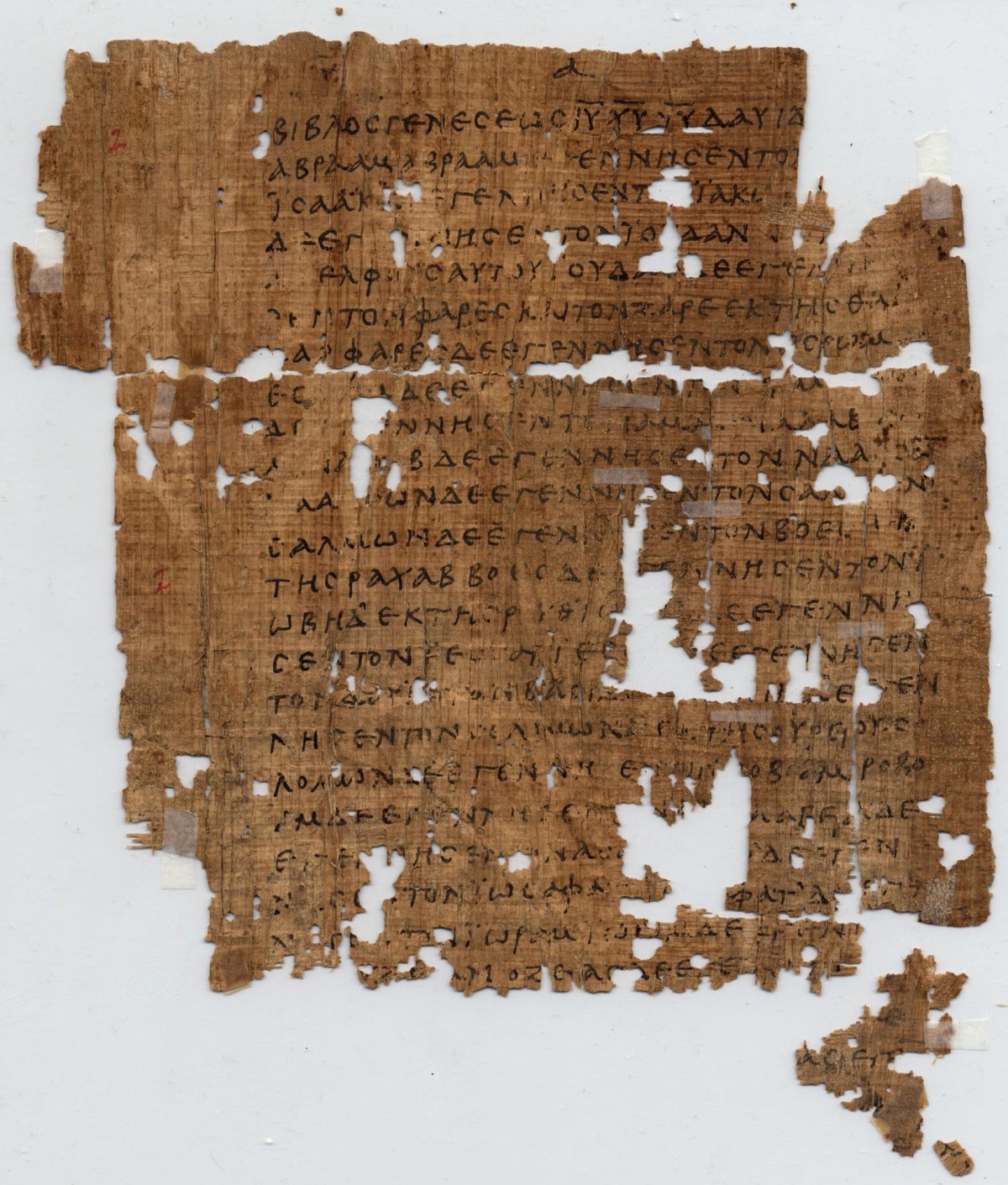 The image is of an early version of the genealogy of Jesus provided in Matthew 1:1-9,12 found on the recto side (the front side) of Papyrus 1, dated to about 250 CE