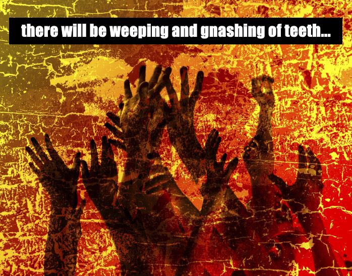 It is found also in subsequent pronouncements: to his disciples during his final apocalyptic teachings (24:51), and in the climactic parable of the sheep and the goats (25:30). In each case, darkness, weeping, and gnashing of teeth are threatened.