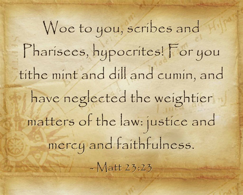 Time after time in this speech, the scathing rhetoric of Jesus indicts the teachers of the Law with their failure to adhere to the Law. Eight times he says that they are hypocrites (23:13, 14, 15, 23, 25, 27, 28, 29). The deduction to be drawn is clear: if those who teach the Law in the synagogues cannot be trusted, because they do not follow the Law in their lives, then whose teaching of the Law should be trusted?