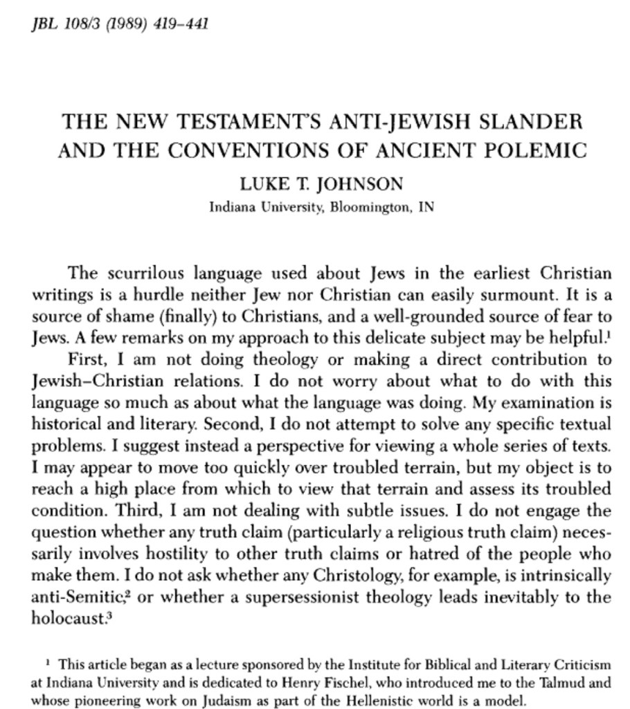 In a 1989 article published in the Journal of Biblical Literature, Luke Johnson has demonstrated that such “rhetoric of slander” was found both within and beyond Judaism. He documents its use by Jews against Jews, most notably in the Dead Sea Scrolls (Community Rule 2:4-10, 4:9-14), but also in the Psalms of Solomon (4:1-5), in what Josephus writes about the Zealots (Jewish War 4.385-388, 5.443-4, 566, 7.260-2), and in assorted rabbinical works.