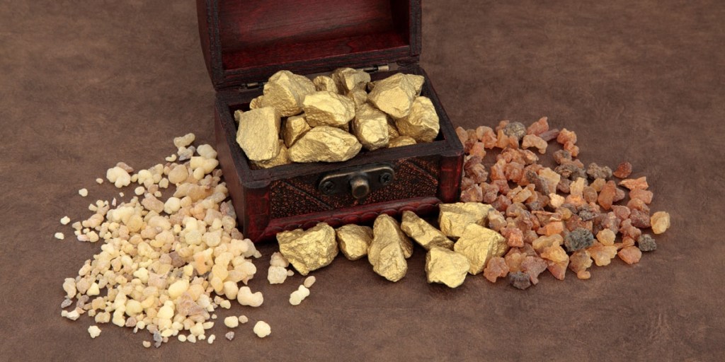 Two of the three gifts draw from later in this oracle (Isa 60:6), reflecting gold and frankincense being brought to Jerusalem by visitors from Sheba (a kingdom in South Arabia). The gifts, it is claimed, are symbolic of what is to come. The gold is considered to symbolise the royal status of the child, as he is of the line of David. The frankincense is connected with the Temple cult, and thus considered a symbol of the priestly role eventually to be played by the child.