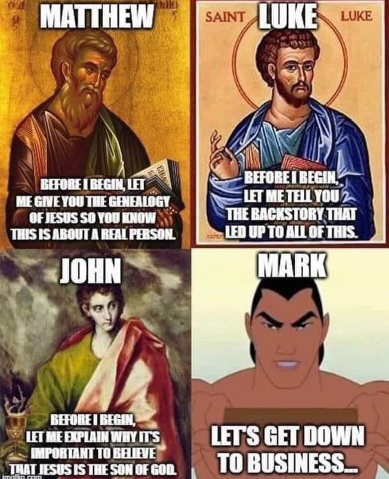By contrast: “Let’s get down to business”, says Mark. And so he does!