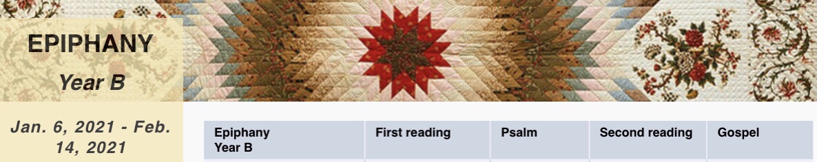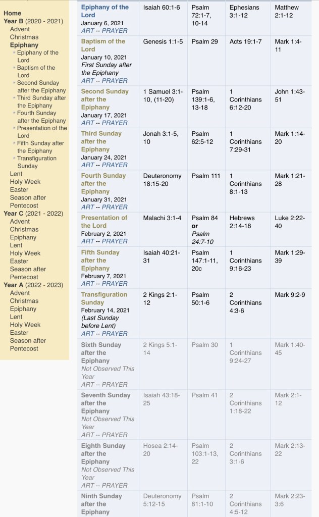 This appears to be the case in the season of Epiphany, during Year B. Whilst the Gospel sections largely trace the opening scenes of Mark (1:1-3:6), the Hebrew Scripture sections are drawn from a range of Hebrew prophets: Isaiah, 1 Samuel, Jonah, Deuteronomy, Malachi, Hosea, and stories about Elisha in 2 Kings. (Not all of these passages, nor all of Mark 1:1-3:6, appear in Epiphany in 2021; in other years, when Easter is later in the year, the season of Epiphany stretches over more weeks, as the image below indicates.)