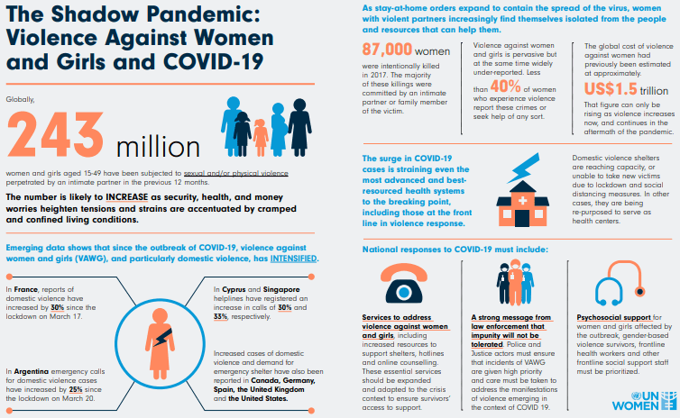 Gender-based violence. Calls to helplines have increased five-fold in some countries as rates of reported intimate partner violence increase because of the stresses introduced by the pandemic. Women are always the vast majority of victims in such situations. (See the discussion by UN Women at https://www.unwomen.org/en/what-we-do/ending-violence-against-women/facts-and-figures)