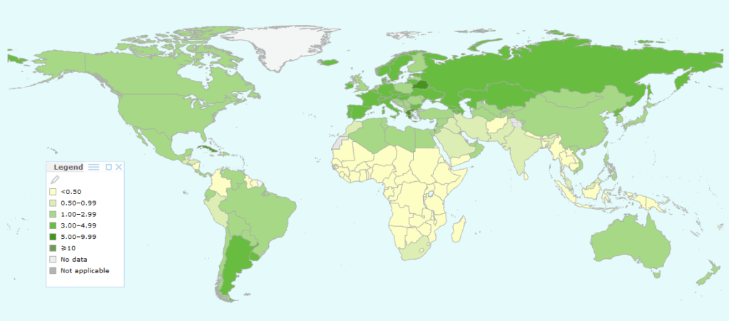 Medical services. Over 40% of all countries have fewer than 1 medical doctors per 1,000 people and fewer than 4 nurses per 1,000 people. By comparison, the figure for Australia is just over 20 doctors and 12 nurses per 1,000 people. (The data is based on World Health Organisation statistics; see https://www.who.int/data/gho/data/themes/topics/health-workforce)
