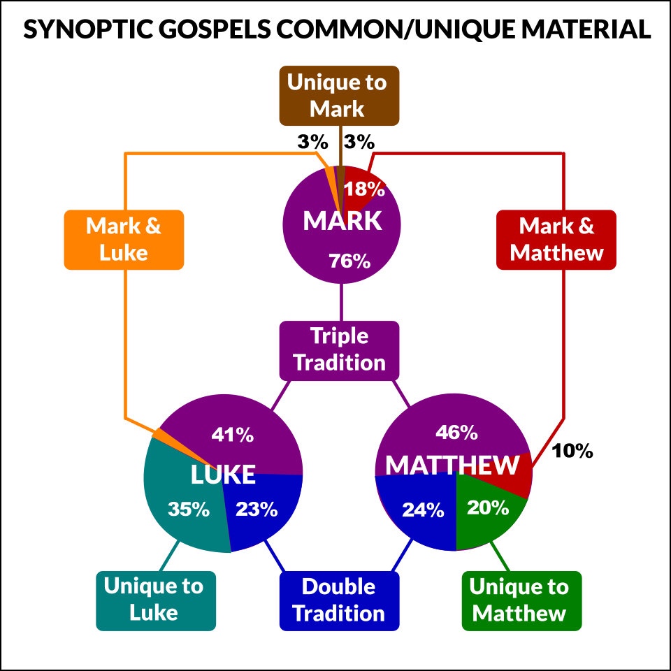 It is this pattern—collections of stories about Jesus in Galilee followed by a journey to Jerusalem and the account of the passion of Jesus—which was adopted (but also adapted) by the authors of the the book of origins (the Gospel of Matthew) and the orderly account of the things fulfilled among us (the Gospel of Luke). Along with the belief that Mark was the first Gospel to be written, there is a widespread belief amongst scholars that a version of Mark’s Gospel was actually used as a written source by the authors of these other two Gospels.