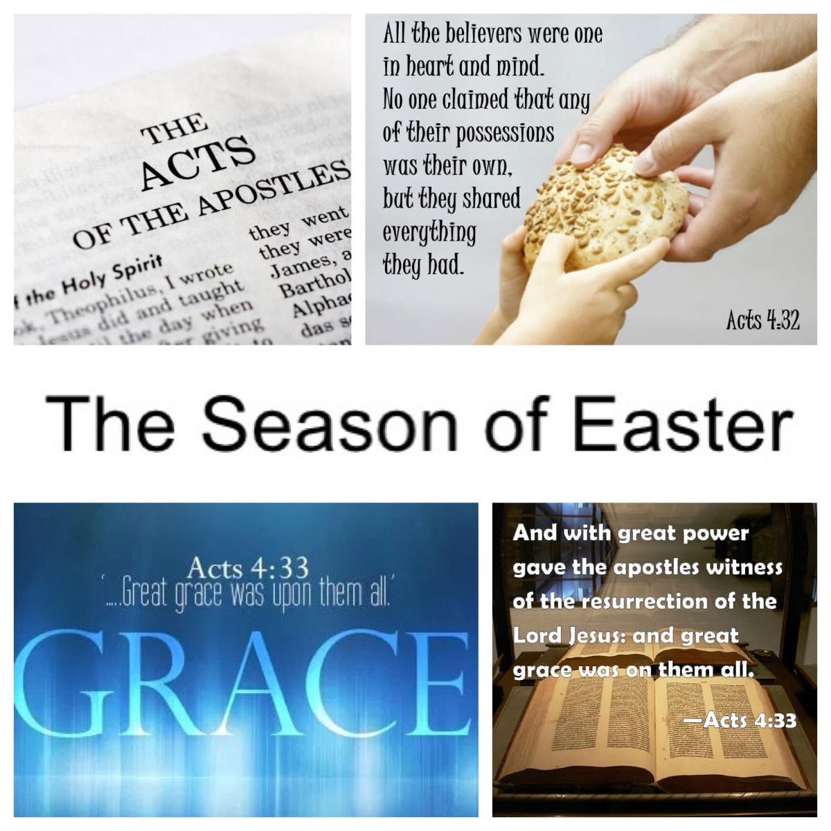 The first mark is unity of purpose (4:32; see 2:42,46). A second mark refers to the powerful testimony to the resurrection that the church offers (4:33; see 2:24,32; 3:15; 4:2). A third mark is the manifestation of grace (4:33b; see 2:47).
