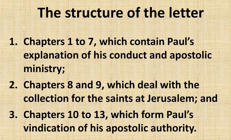Indeed, the integrity of 2 Corinthians as we know it has been questioned, and scholarly scrutiny of the form and contents of the letter even suggests that it may be a composite of two, three, or even four letters which were originally separate communications. So Paul’s fourth letter to Corinth, which we call 2 Corinthians, is comprised of a number of main sections, each of which has its own distinctive focus.
