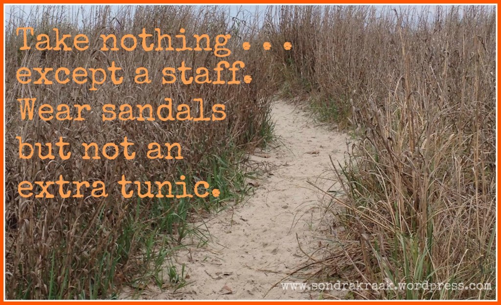 “He charged them to take nothing for their journey except a staff—no bread, no bag, no money in their belts— but to wear sandals and not put on two tunics.” So Jesus instructs his followers (6:8–9). In the parallel passages for this incident, Jesus is even more strict. In Luke, he prohibits sandals as well (Luke 10:3), and in Matthew, he prohibits both sandals and staff (Matt 10:10)