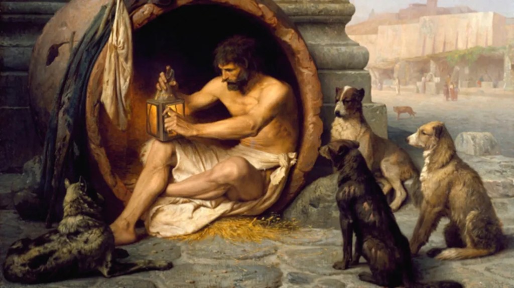 Cynic philosophy is named after Diogenes of Sinope, who lived c.400–325 BCE. Diogenes was known as “the dog” (kunos, in Greek) because of his shameless and primitive style of living. Diogenes was given the nickname ‘the dog’ because of his shamelessness. He used to live in a barrel with his only possessions being a robe to wear and a stick to walk.
