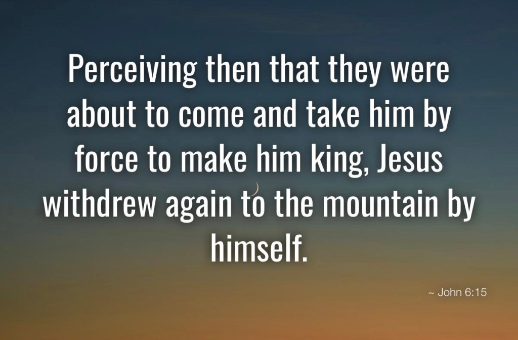 And to a pious Jew like Jesus, it was clear beyond doubt that only God was king over Israel (Ps 72)—indeed, over the whole earth (Ps 47). Jesus definitely wants to avoid such an acclamation about him at this point. The crowd are misunderstanding him. So he withdraws.