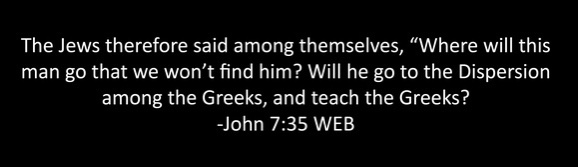In the book of signs, the Gospel of John, Jesus moves freely between Galilee and Judea, a number of times; but there is no indication that he visited Gentile territory, despite the question of people in Jerusalem, “does he intend to go to the Dispersion among the Greeks and teach the Greeks?” (John 7:35).