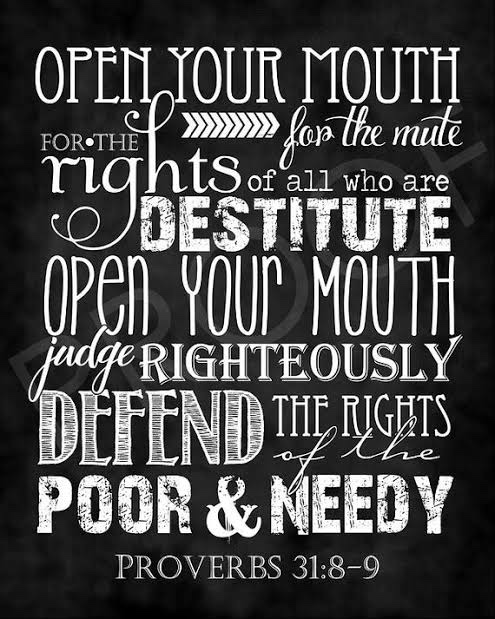 Taking care that justice is done also requires speaking out for those who are silenced, marginalised, oppressed, or persecuted. In Proverbs, the sage advises, “Open your mouth for the mute, for the rights of all who are destitute. Open your mouth, judge righteously, defend the rights of the poor and needy.” (Prov 31:8–9).
