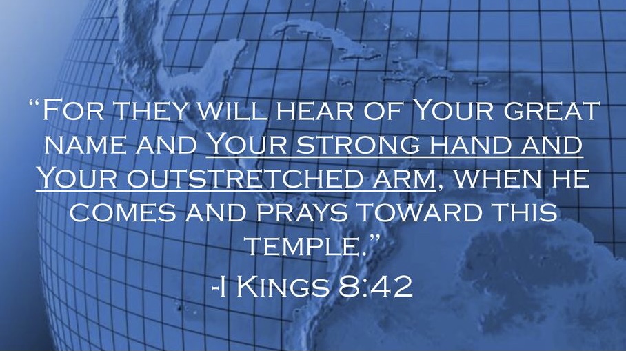Solomon prays to God, imploring God to “hear in heaven your dwelling place and do according to all for which the foreigner calls to you, in order that all the peoples of the earth may know your name and fear you, as do your people Israel, and that they may know that this house that I have built is called by your name.”