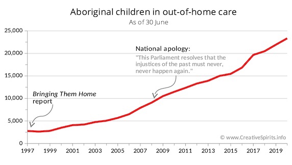 The continuing saga of Aboriginal children being taken from their homes remains with us today, to our national shame. Even in the 21st century, indigenous children continue to be taken from their families. In fact, there are far more Aboriginal children in out-or-home care now, than there were in 1997 when the Bringing Them Home report exposed countless stories of terror and tragedy amongst the Stolen Generations.