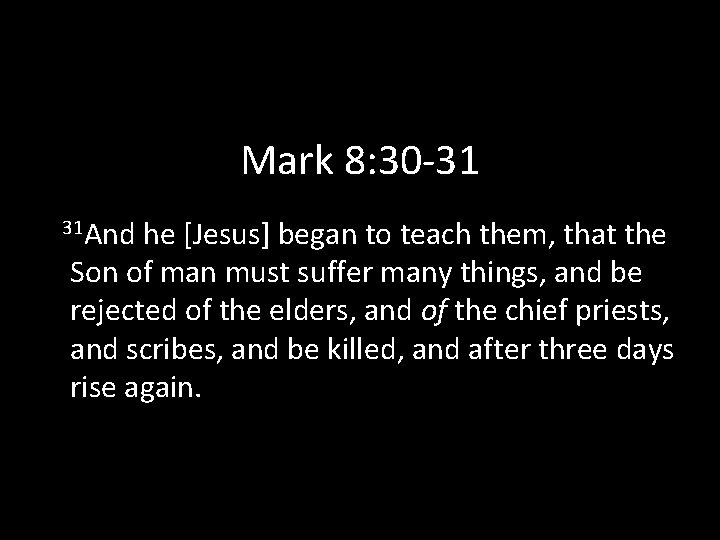 So important is this teaching, that Jesus repeats it twice more: “The Son of Man is going to be delivered into the hands of men, and they will kill him. And when he is killed, after three days he will rise” (9:31) and “the Son of Man will be delivered over to the chief priests and the scribes, and they will condemn him to death and deliver him over to the Gentiles; and they will mock him and spit on him, and flog him and kill him; and after three days he will rise” (10:33-34).