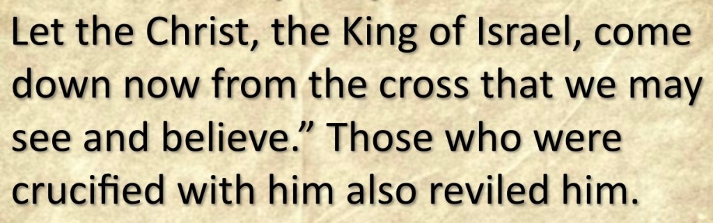 There is one place where Jesus is acclaimed as Messiah, with no come-back from Jesus: when the crowd of onlookers cry out to Jesus as he hangs on the cross: “let the Christ, the King of Israel, come down now from the cross that we may see and believe” (15:32). This isn’t an affirmingly positive acclamation of Jesus; rather, the term is used to mock and deride him in his helpless state.