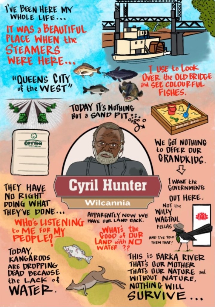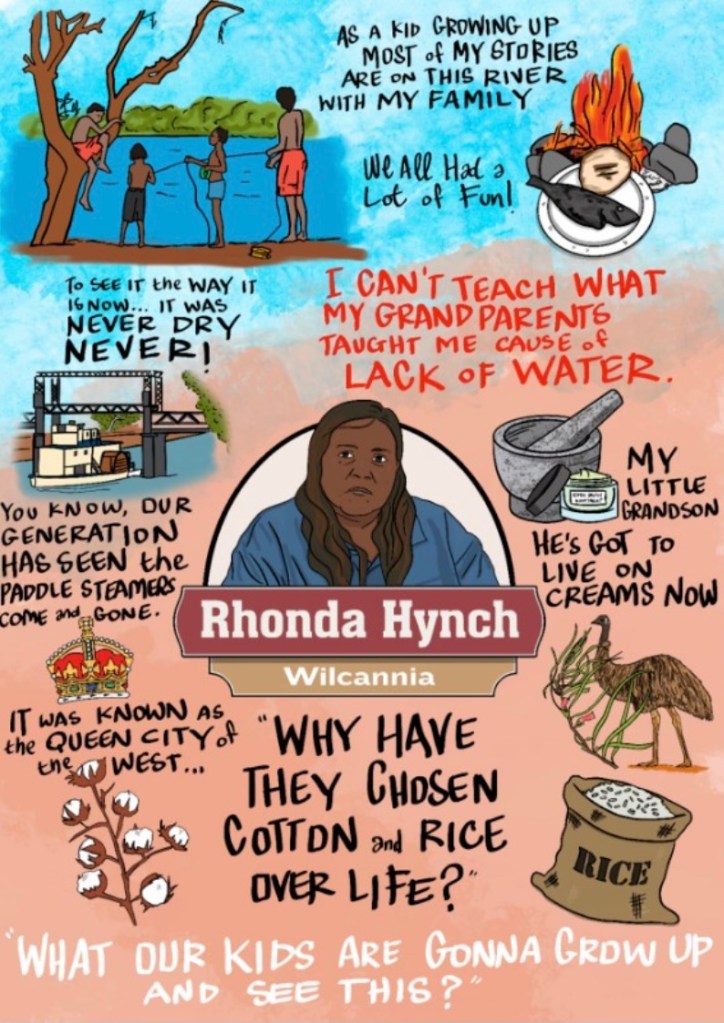 Testimonies were given by 17 residents from Menindee and 15 from Wilcannia. The lived experiences of these Menindee and Wilcannia residents, given at the Citizen’s Inquiry, came together in a virtual exhibition on 15-22 September 2021. Convened by the Water Justice Hub, the ‘Aquawhen?’ exhibition was delivered via an online platform that amplifiedthe Voices of the Barka to the world. This exhibition included pictorials created by artists Rix Lee and Tom Horne for each testimony and two short films created by Dan Schulz and Otis Filley; one filmed in 2019-20 when the river was dry and another in 2021 that coincided with high stream flows.