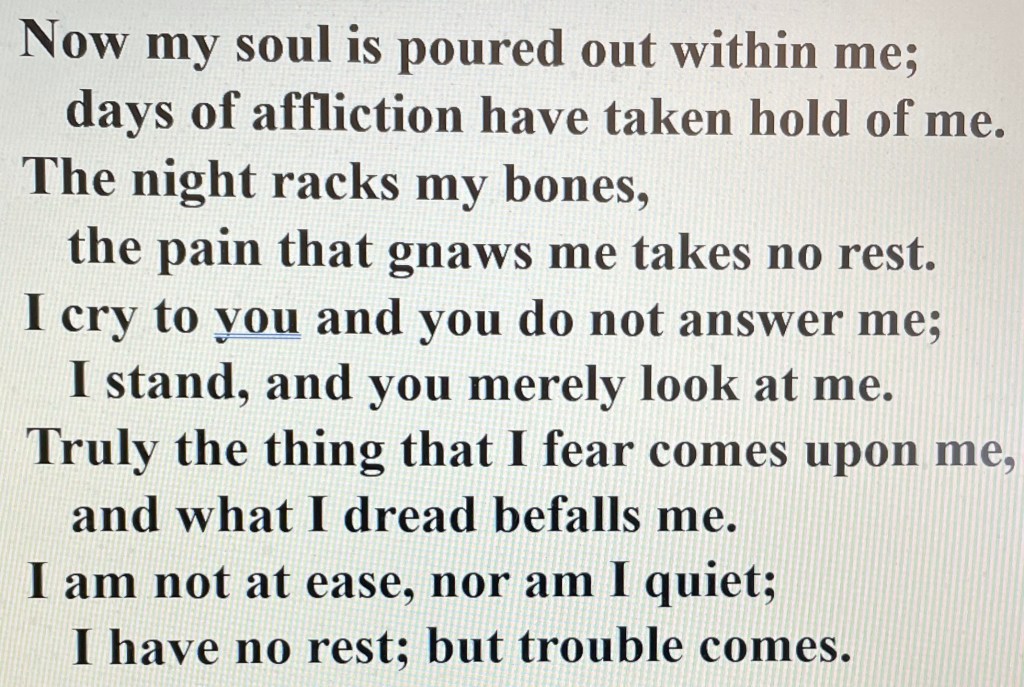 Throughout Job’s speech, there is a great sense of longing for God’s presence, for God’s attention and for God’s caring. This is surely a feeling that can resonate with us all and many of us may have experienced in tragic circumstances.