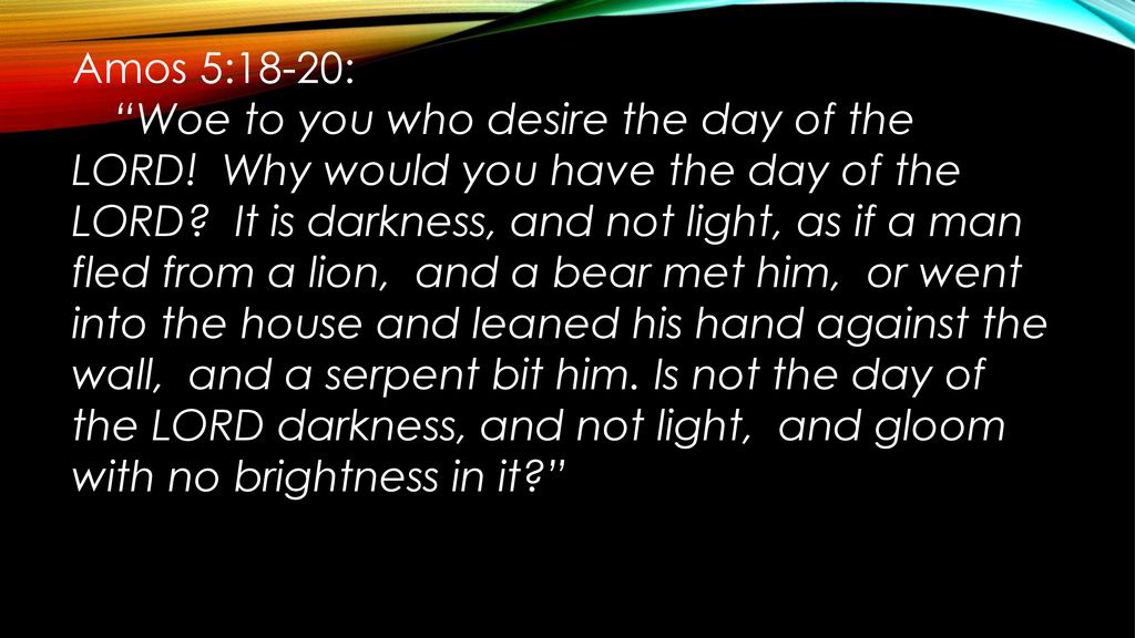 That image of The Day when the Lord enacts justice and brings punishment upon the earth, because of the evil being committed by people on the earth, enters into the vocabulary of prophet after prophet. Amos himself declares that it is “darkness, not light; as if someone fled from a lion, and was met by a bear; or went into the house and rested a hand against the wall, and was bitten by a snake. Is not the day of the LORD darkness, not light, and gloom with no brightness in it?” (Amos 5:18–20).