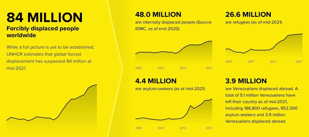 Despite COVID-related movement restrictions and pleas from the international community for a ceasefire that would facilitate the COVID-19 response, displacement continued to occur – and to grow. As a result, above one per cent of the world’s population – or 1 in 95 people – is now forcibly displaced. This compares with 1 in 159 in 2010.