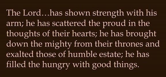 “He has shown strength with his arm; he has scattered the proud … he has brought down the powerful and lifted up the lowly … he has filled the hungry with good things, and sent the rich away empty” (1:49–55).
