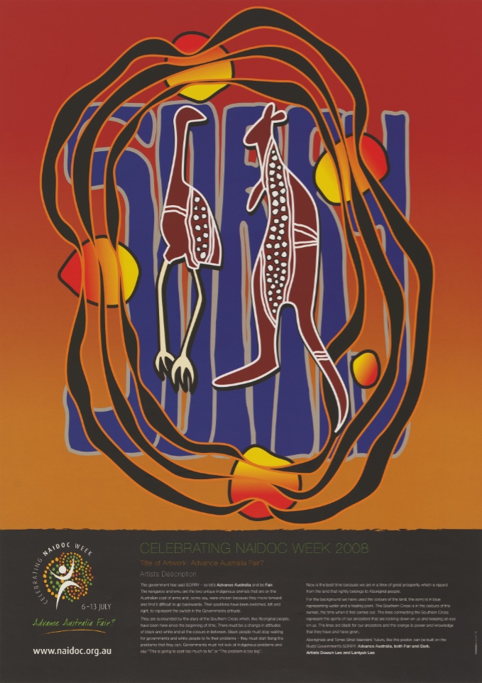 This theme recalls both the 1972 theme, Advance Australia Where?, and, of course, the title of the song that became Australia’s national anthem, Advance Australia Fair. The question mark in both themes is very significant—the themes are asking questions about the direction of Australia as a country (in 1972) and drawing attention to the continuing injustices experienced by Indigenous peoples (in 2008). The questions still stand today.