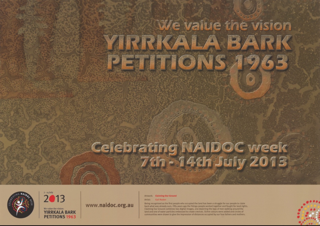 This theme commemorates events of 50 years earlier. Yolngu people from Yirrkala in eastern Arnhem Land in the Northern Territory sent petitions to the Commonwealth Parliament in August 1963. On 13 March that year the Government had removed more than 300 square kilometres of land from the Arnhem Land reserve, with the purpose of being able to mine the bauxite which had been found there. Work started without talking to the people about their land.