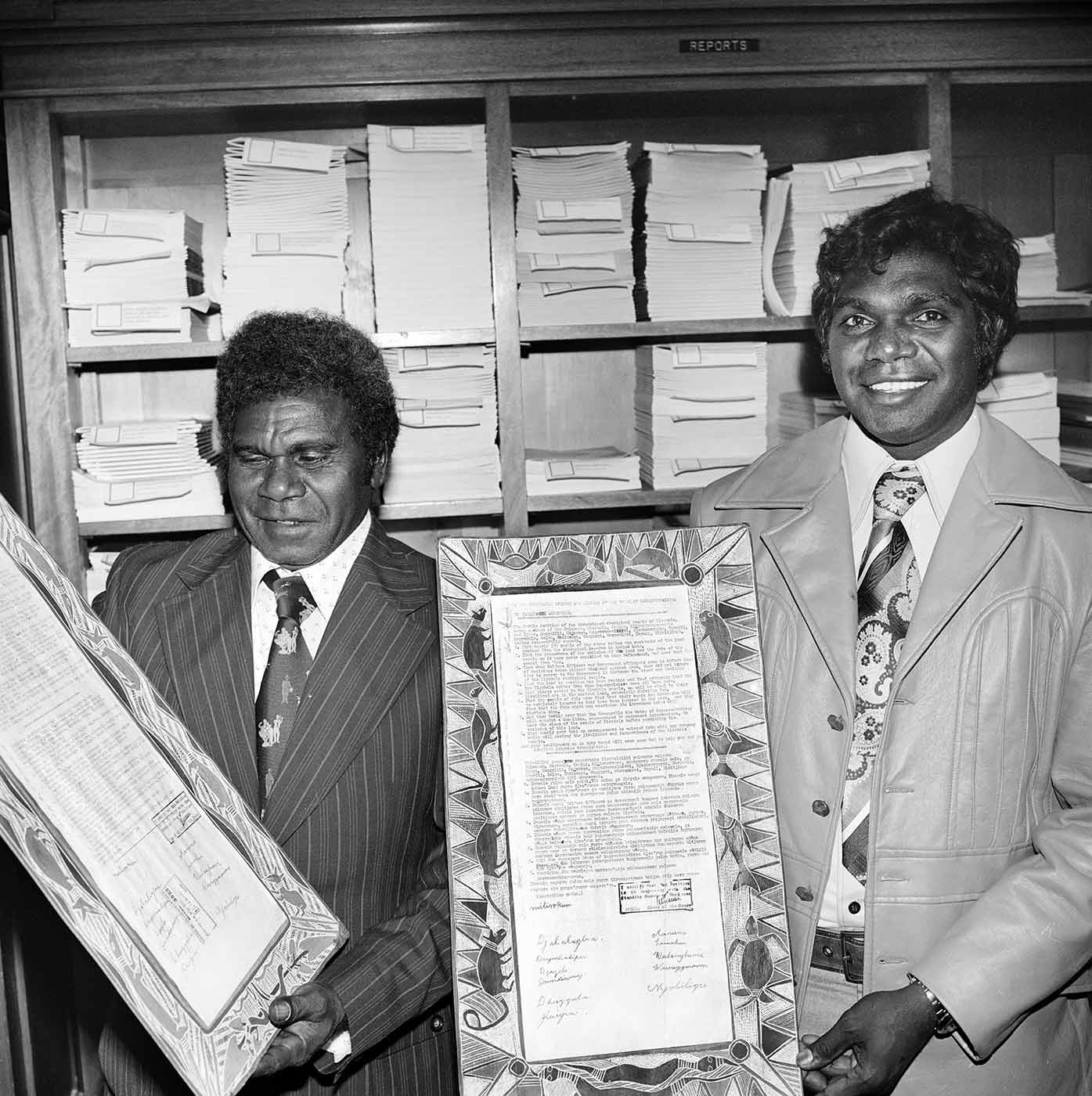 Silas Roberts, Northern Lands Council (NLC) Chairman (left), and Galarrwuy Yunupingu, NLC Manager (right), with the Yirrkala bark petition