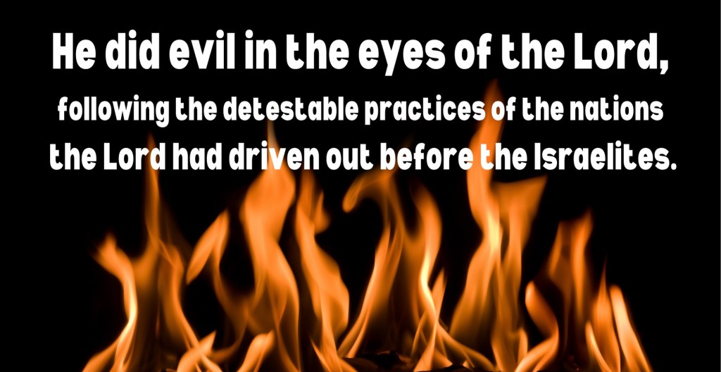 The same formula recurs in 2 Chronicles, where it is applied to Jehoram, Ahaziah, Manasseh, Amon, Jehoiakim, Jehoiachin, and Zedekiah, as well as more generically to “our ancestors [who] have been unfaithful” (2 Chron 29:6).