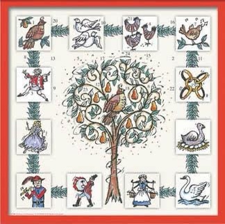 Since the gifts are cumulative, and repeated on each day, on Day Twelve we actually have drummers drumming, along with piping pipers, leaping lords, bleating cows, tapping toes, shuffling shoes, a horde of aviary escapees, and the whole schemozzle. 78 gifts in all (count them) just on this last, twelfth, day. Presumably the others gifts from earlier days are still there. That’s one heck of a menagerie!! It’s all too loud, I think — and the incessant fights amongst all those squawking birds! Oh dear; time for a doze, instead.