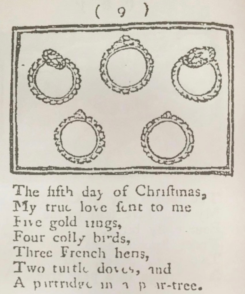 Five Gold Rings from “The Twelve Days of Christmas sung at King Pepin’s Ball” in Mirth without Mischief (London: Printed by J. Davenport, George’s Court, for C. Sheppard, No. 8, Aylesbury Street, Clerkenwell [ca. 1780 or 1800?])