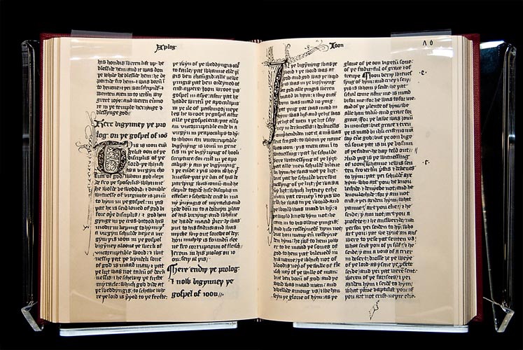 This copy is a facsimile reproduction of the very first translation of the Scriptures into the English language. The Wycliffe translations were hand-written manuscript Bibles, pre-dating printing by 70 years [Gutenberg, 1455]. https://digitalcommons.cedarville.edu/preserved_by_hand/7/