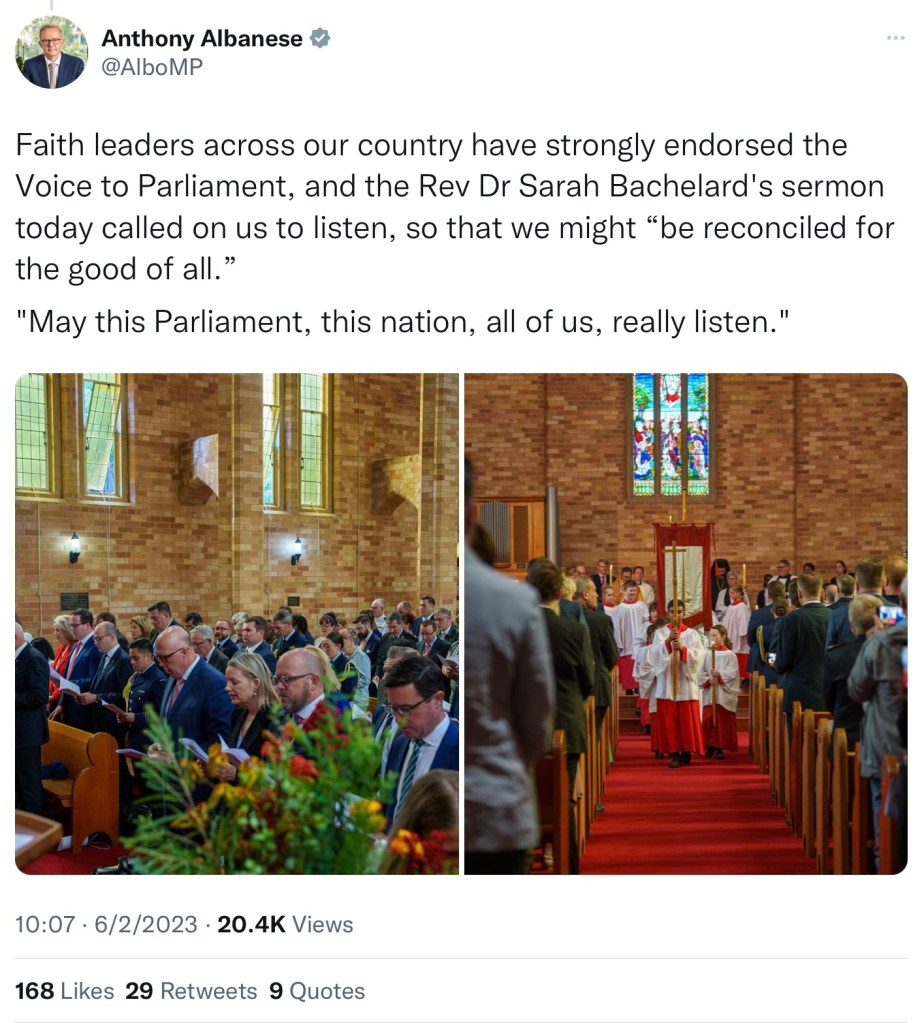 In a “doorstop” media interview after the service, two of the four questions asked of the Prime Minister related to the issue of a Voice. He was asked, “When do you think you will want to introduce legislation and set up the Voice? Would it be in this term of Parliament?”