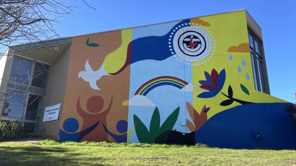 As a whole, the mural offers the community of the Tuggeranong Valley the symbols of the Gospel: hope and growth, an inclusive welcome and a resilient future. A large dove hovers in the sky, while rain falls to nurture the earth, symbolising the TUC commitment to environmental responsibility. The Uniting Church logo is surrounded by dots, representing a desire to seek reconciliation with First Peoples, whilst a rainbow signals the welcome extended to members of the LGBTIQA+ community, who participate both in the Rainbow Christian Alliance at TUC and in Sunday morning worship.