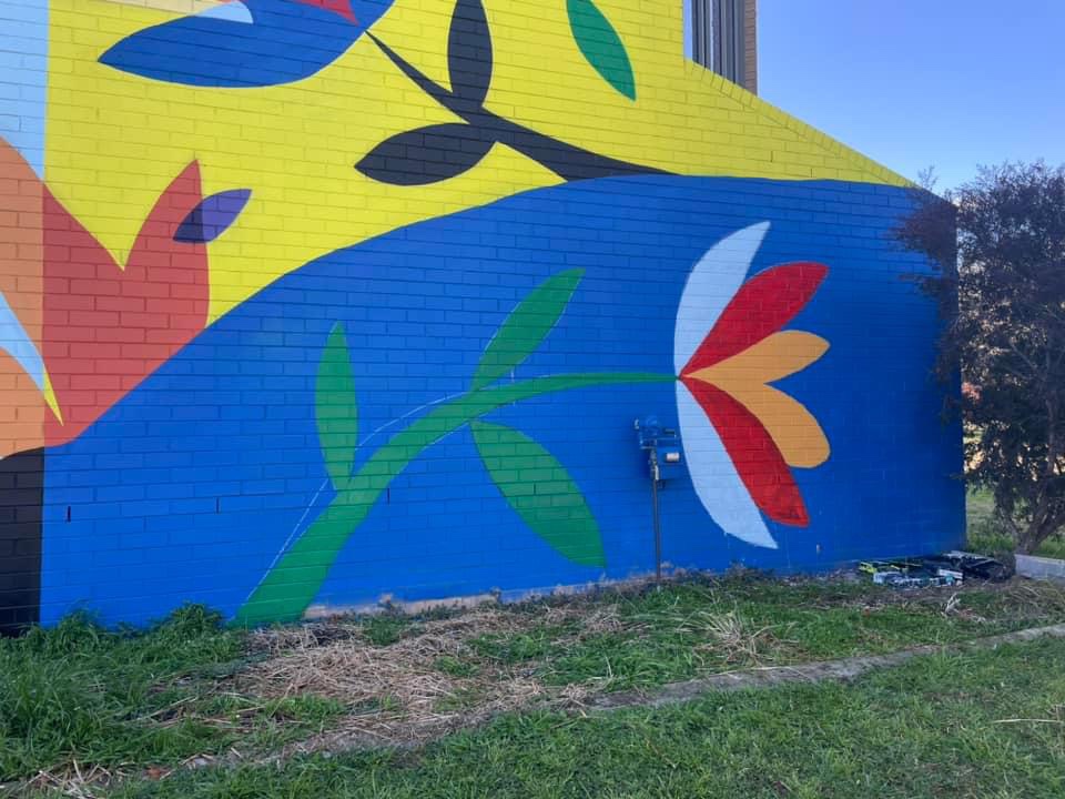 The bottom right-hand section of the mural, complete after members of the Congregation finished the painting of a beautiful sprouting flower!