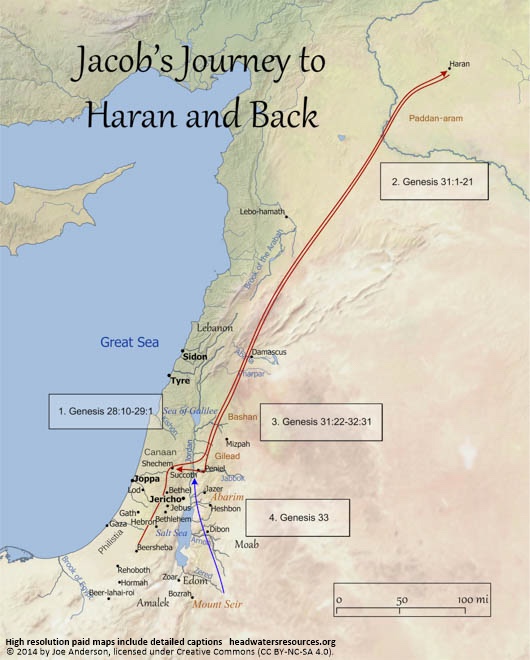 Whether he had been tipped off about this by Rebekah, or not, Isaac commissions his son to journey back to the homeland—in another case of “don’t marry one of these folks, go back to our homeland and marry one of our own” (as we saw with Abraham and Isaac). Isaac says to Jacob, “you shall not marry one of the Canaanite women; go at once to Paddan-aram to the house of Bethuel, your mother’s father; and take as wife from there one of the daughters of Laban, your mother’s brother” (28:1–2). So Jacob obeys him.