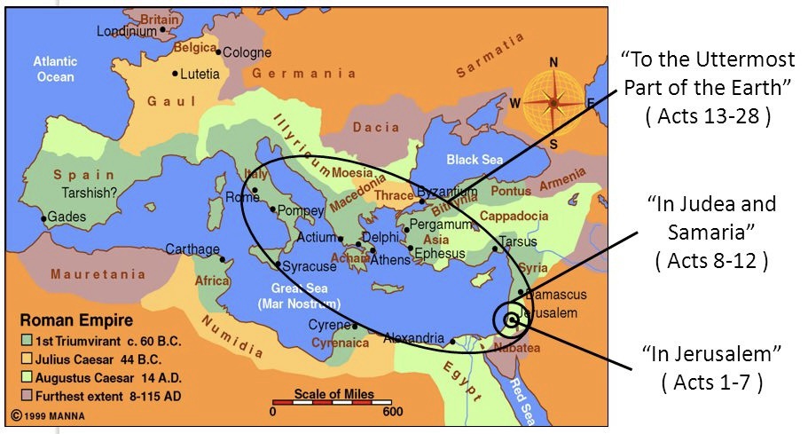 These departing words of the Lukan Jesus neatly conjoin the geographical pattern and theological foundation of Acts: from Jerusalem outwards, the divine spirit will enable followers of Jesus to bear witness to the sovereignty of God.
