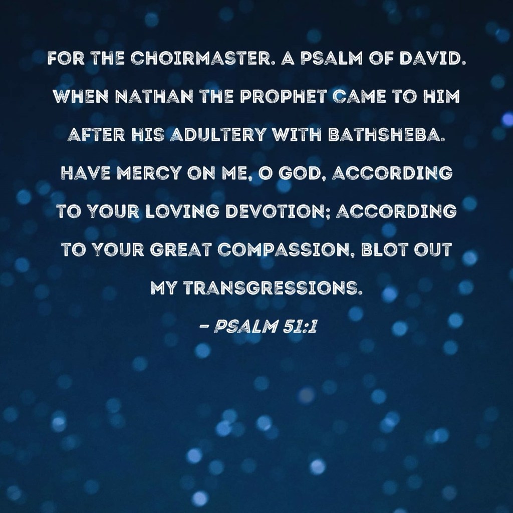 The ascription at the head of this psalm makes the traditional connection with David (as is also the case with 72 other psalms in the book), and provides a specific occasion for the writing of this psalm: “when the prophet Nathan came to him, after he had gone in to Bathsheba”. It would seem that the psalm first this occasion quite neatly.