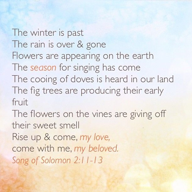 Gledhill notes that “the tiny spring flowers are sparkling forth amongst the new shoots of the undergrowth … there is a hint of future blessings in the references to the fig tree and the vines in blossom. Our lovers are part and parcel of this explosion of new life and new hope.” (The Message of the Song of Songs, IVP, 1994, pp. 132–133). Is this perhaps a pointer to the divinity that these poems are making? — a pointer to the deity who creates the world and oversees the cycles of fertility and abundance?