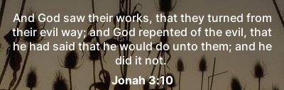 Previously, in Exodus 2:23–25, God had changed their mind and re-membered the covenant with Abraham, Isaac, and Jacob. In that instance, God responded to the groans and cries of the people. There is a comparable event in Nineveh: “When God saw what they did, how they turned from their evil ways, God changed his mind about the calamity that he had said he would bring upon them” (Jonah 3:10).