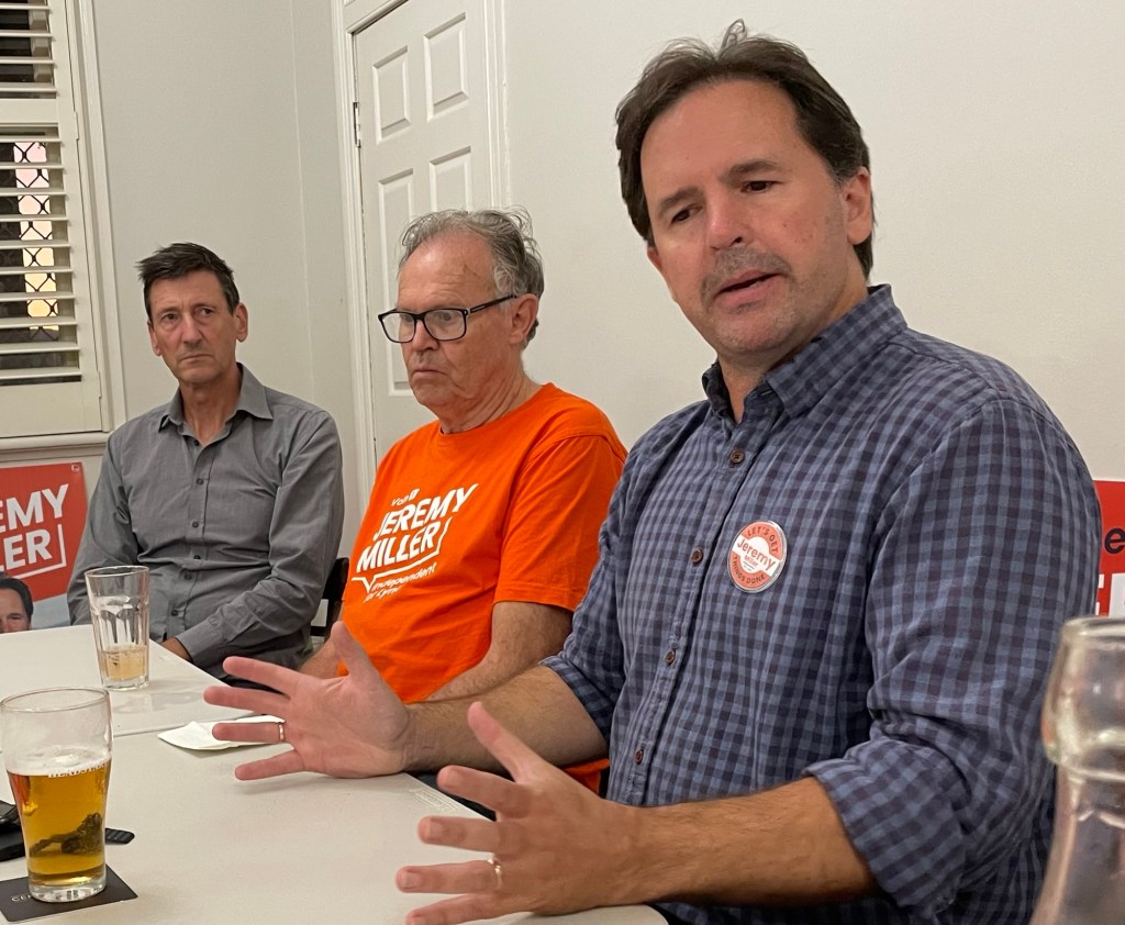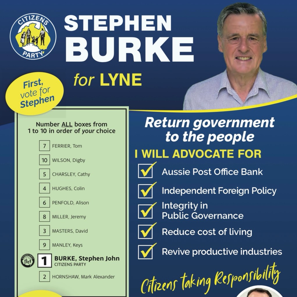 Jeremy Miller (Independent) is standing with the support of Independent Lyne, a local community movement. He has lived 30 years in the area, after moving from Canberra to Taree. Married with three kids, two at university, he now runs two businesses in Taree, employing 14 people. “I am not a typical politician”, he said; “I am not a lobbyist, but a business person who wants to get things done.” He believes it is time for something new, other than “the two tribes”.