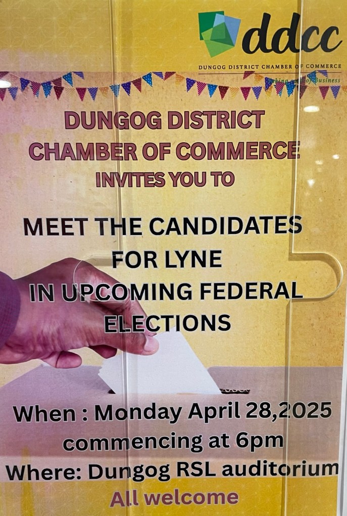 The night ended with three specific questions relating to Dungog Shire being put to the candidates for their short response each in turn: recognising some local roads as State roads, thereby attracting funding; keeping in person government services in the town; and how to maintain more youth in the town. The answers given reflected the varying experiences of the candidates, in local and Federal roles, as well as the general policy platforms on which they were standing.