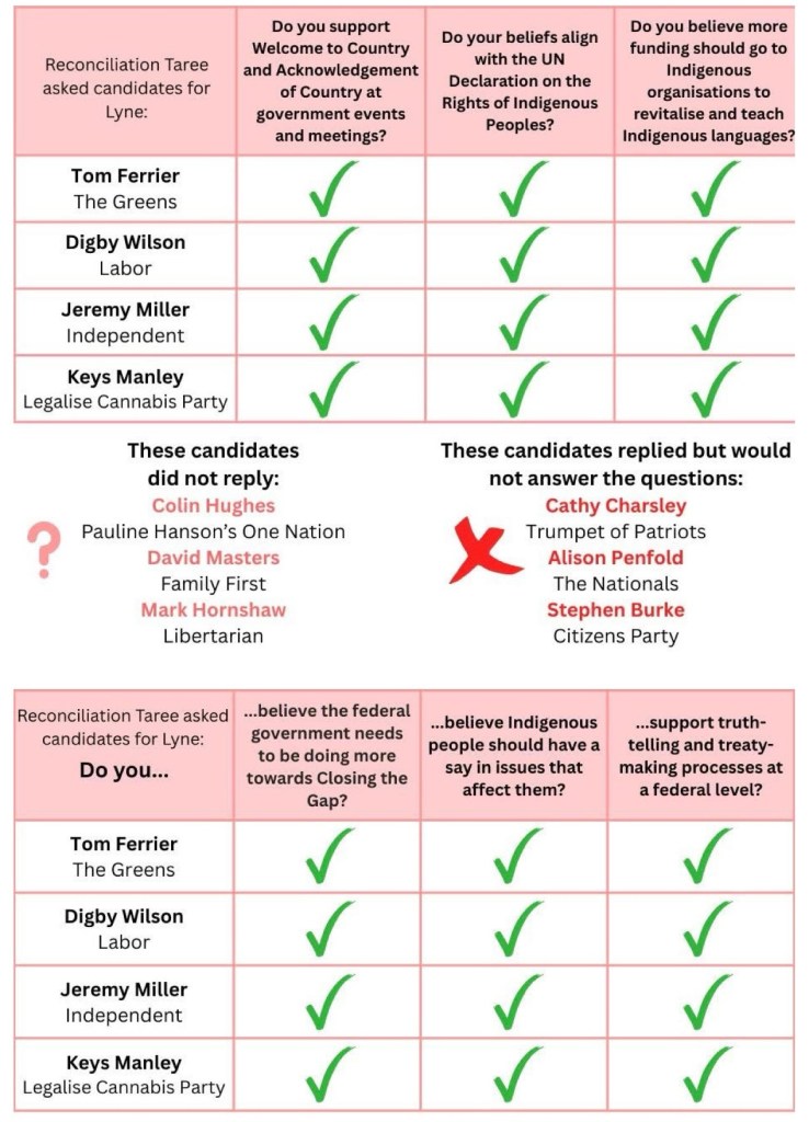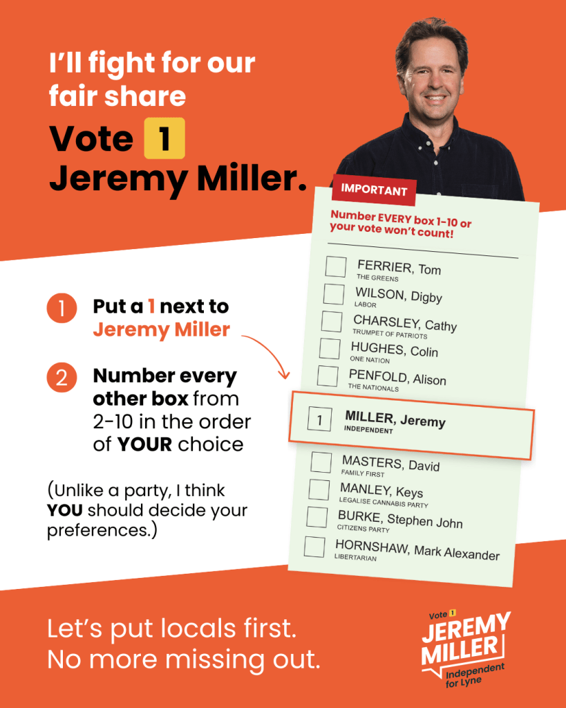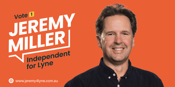 Independent Lyne has been modelled on the process used in the Indi electorate, with a strong grassroots movement developed by Cathy McGowan, and then used by Helen Haines. Kitchen table conversations were held across the electorate, with the results reported in a Listening Report. The group called for applications, then chose a candidate through a grassroots process. If he is asked “what do you stand for?”, Jeremy points to the results of that listening phase, which has shaped the policies he stands for.