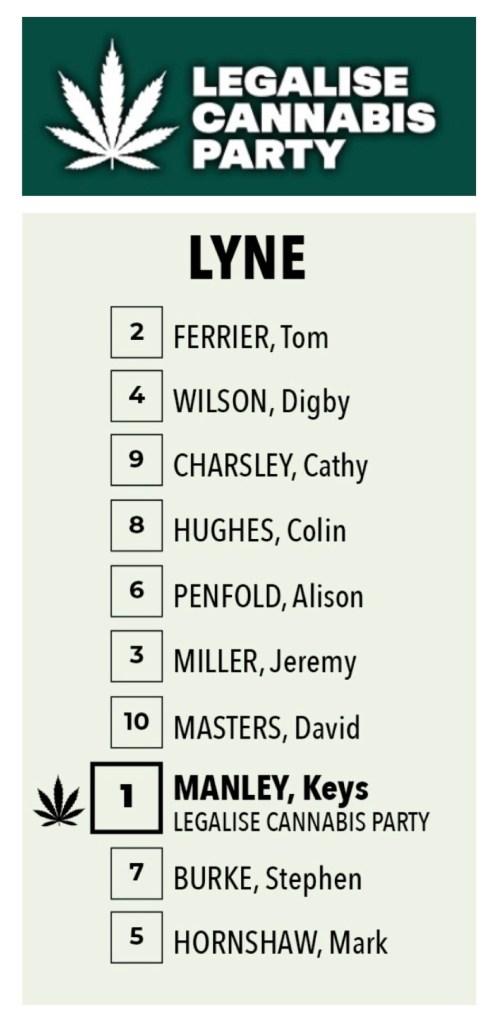 Keys Manley (Legalise Cannabis) has family links with Taree and Wingham, where he grew up. In 2017, he was diagnosed with a genetic mutation predisposing cancer. After a series of operations, he was introduced to medical cannabis, with oils and balms used as well. At a fourth operation to remove polyps, he was given a clean bill of health. He has since learnt about the many benefits of cannabis across many industries. It has saved his life. It offers many benefits in so many areas.