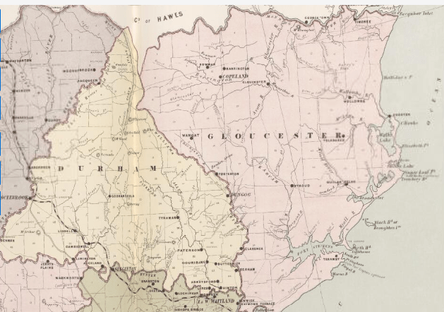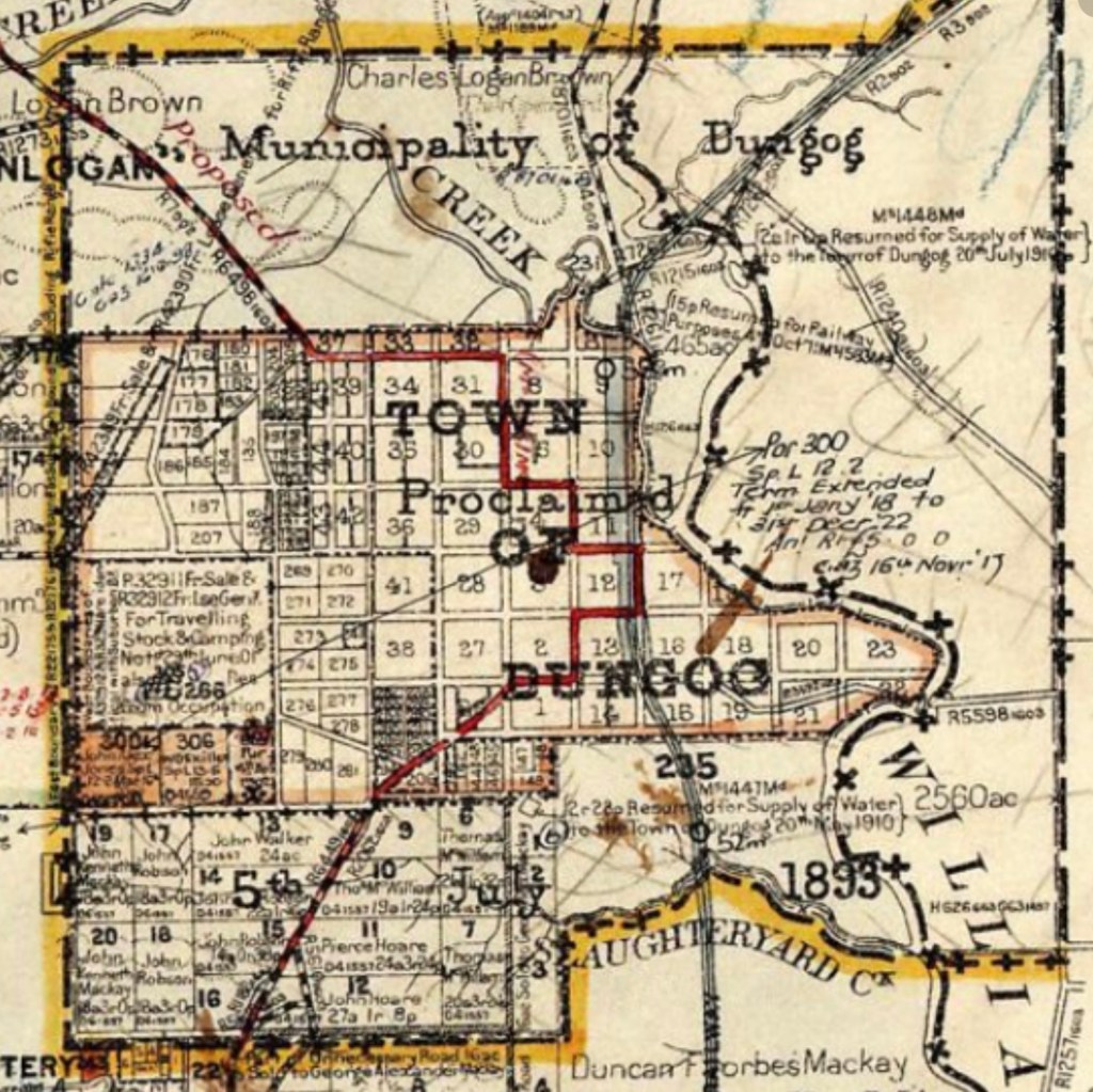The block of land which we recently bought was originally bought under the system of colonial landholding by James Fawell on 9 May 1842. It cost him £4.0.0. The legal documentation identifies it as “Lot No. Seven Section No. Five in the Town of Dungog”. Section Five is the block bounded by Dowling, Brown, Lord, and Mackay Streets. Dowling St runs along the ridge beside the Williams River, and it developed early into the street of commerce for the town.