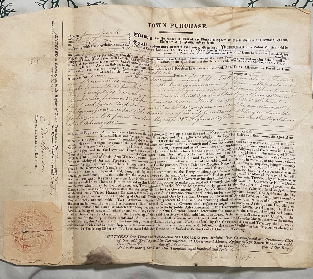 James Fawell purchased the block of land on 9 May 1842 for £4. The Grant by Purchase document states that he was using “part of the Remission of Twenty five Pounds Sterling Authorised for him as a late private in Her Majesty’s 80th Regiment of Foot under the Regulations of 15th February 1840”. This was a regiment raised in 1793 in Staffordshire; it saw action in Flanders and the Netherlands and it was part of the British force that expelled Napoleon from Egypt in 1801. The Regiment served in India from 1803 to 1817.