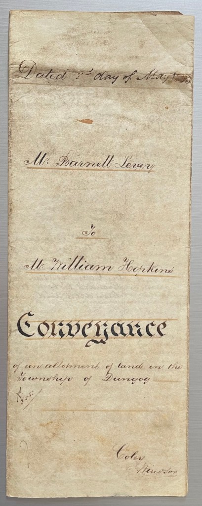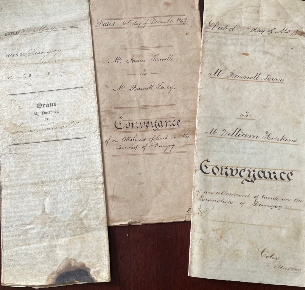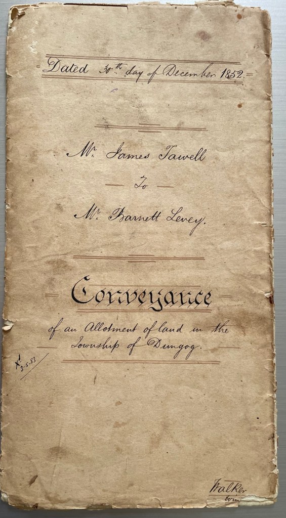 Fawell owned the land for a decade. A Conveyance dated 30 December 1852 reports that James Fawell of Windsor, Settler, sold this land to Barnett Levey of Windsor, Innkeeper, for Nine Pounds Sterling.