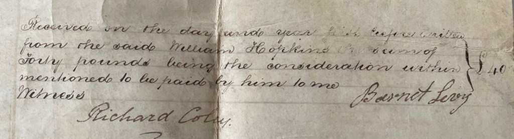 The next owner was William Hopkins. Levey held the land for less than three years; a Conveyance dated 2 May 1855 documents the transaction between Barnet Levey of Windsor, Dealer, and William Hopkins of Windsor, Miller. The land cost Hopkins Forty Pounds Sterling, so Levey had received more than three times what he paid for the land in 1852.