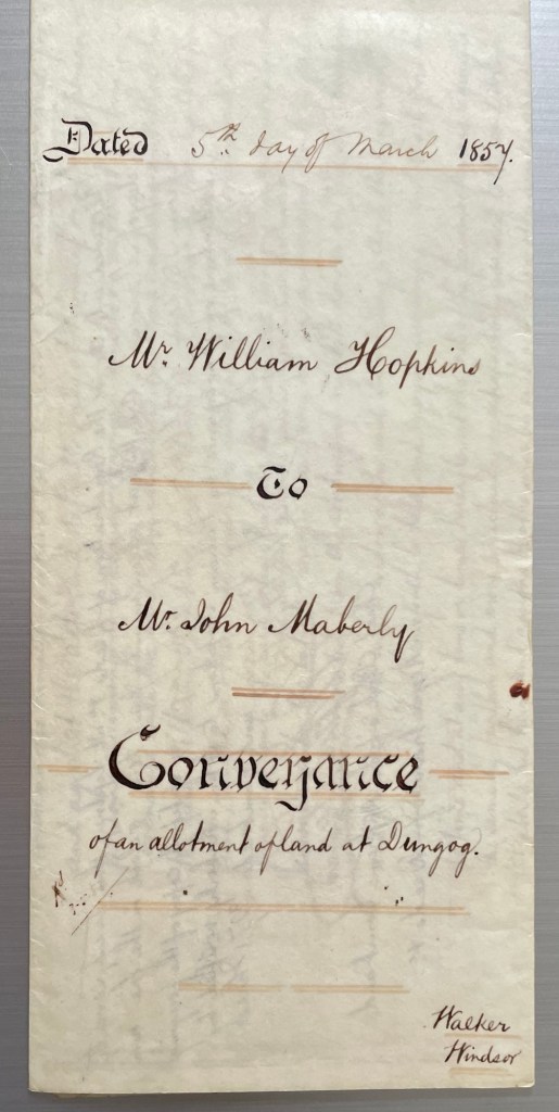 Within less than a year, Maberly had sold the land. In a Conveyance dated 30 January 1858 between John Maberly of Windsor, Boot and Shoe Maker, and Daniel Bruyn of Dungog, Blacksmith, the transfer was effected for a price of fifty three pounds ten shillings.